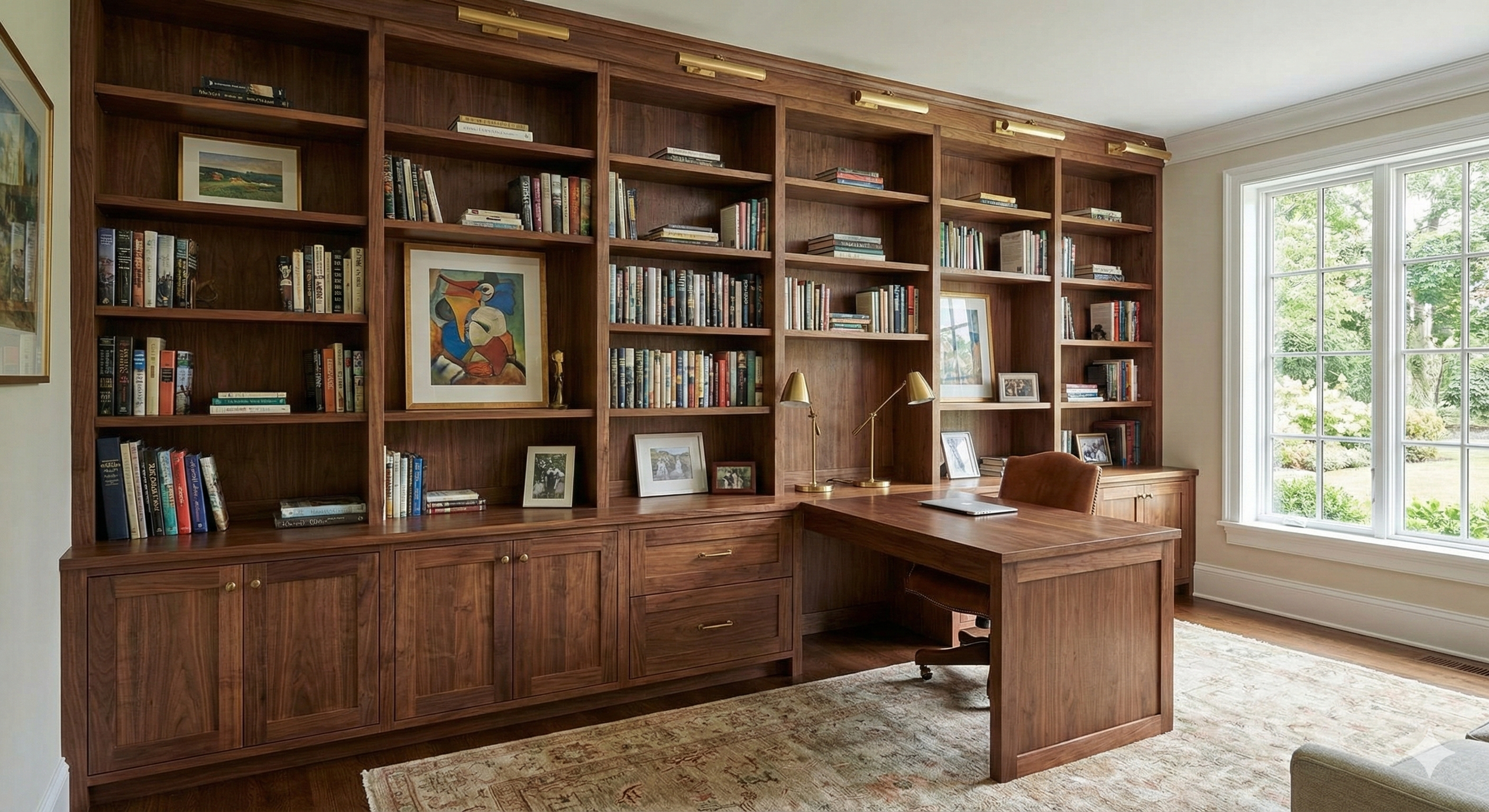 The Library & Home Office Create a workspace that commands respect. We design floor-to-ceiling book walls, rolling ladder systems, and executive desk surrounds that turn a spare room into a sanctuary.